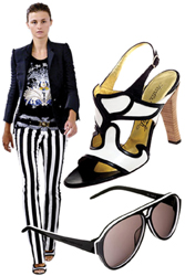 航海风貌的热潮继去年一直延续至今,条纹图案依旧可以成为选择的目标,只是本季的设计为航海主题略添了几分女性柔美的元素。银色绞绳式高跟凉鞋;金色船锚和红珊瑚串成的项链;玫瑰红与蓝色条纹拼合而成的tubetop式的连衣裙裙摆都镶着亮钻。这一系列元素都为一向中性化的航海设计增添了女性主义色彩。牛仔布和斜纹布依旧热门,Diesel的白色牛仔裤和衬衫、Trovata的绿色白边T恤和宽松的阔口裤都是时尚达人们的宠儿。