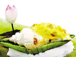 这道菜就是睡莲花酿响螺。它用螺肉、鲜芡实、鲜淮山、沙葛及南瓜做馅,酿在响螺壳中焗香。这道菜的材料非常丰富,口感也很有层次。