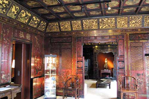 红楼的第二层比底层更为富丽堂皇,其墙壁全部以明代、清代花鸟人物漆画壁板为装饰,配以花鸟浮雕藻井和家具,中式雕花床被改成了壁龛,里面陈设着佛像与画卷,窗户也做成中式雕花窗棂,十足中国传统建筑的风姿。即便在中国,现在都很难找到如此地道的房间了。
