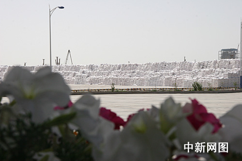 蒙古语意为“盐泽”的察尔汗盐湖雄浑独特,是柴达木盆地沧海桑田的历史见证。湖区海拔2670米,位于格尔木市区以北60公里处。盐湖总面积为5856平方公里,它是柴达木四大盐湖中面积最大、储量最丰的一个,也是中国最大的天然盐湖,现已建成中国最大的钾肥生产基地。图为青海盐湖发展有限公司门前的花坛与堆放的钾肥,既重风景,又保生产,是这一基地最大的特点。