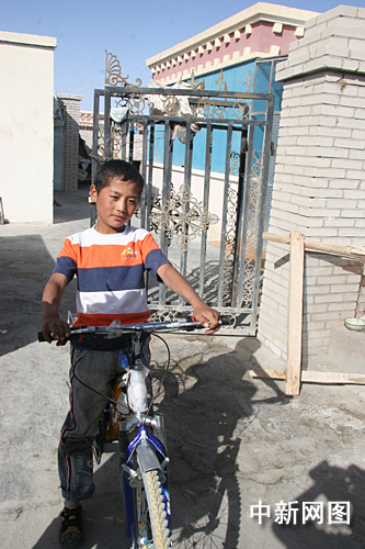 十岁的藏族小朋友索南贡嘎骑着自己的新自行车站在自家的新房门前。他是藏族移民下一代的缩影,也体现了近几年来藏族百姓的生活质量有了实实在在的提高。