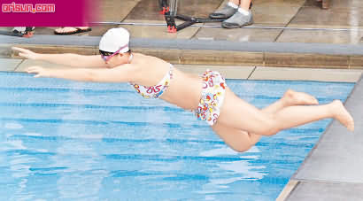拍摄跳水戏时,胡杏儿直堕泳池,即时溅起不少水花。