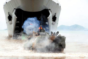 7月上旬,东海某海域,风紧云急,怒涛汹涌。由东海舰队某登陆舰部队组织的一场诸兵种联合登陆演练在风浪中展开……笔者跟随国产新型大型登陆舰随舰出海,目睹了我海军登陆舰艇编队在战术背景下的联合登陆演练全过程。