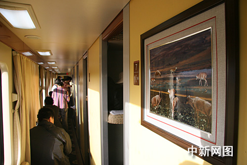 青藏铁路列车极具青藏特色,在硬卧车厢中还专门悬挂了藏羚羊等主题的照片。