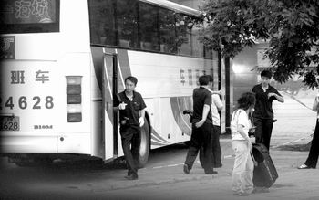 下午3时30分许,东城公安分局副局长田壮首先登上大巴车。
