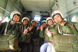 最紧张、最困难、最惊险的每人两次空中跳伞被姑娘们勇敢地抛在了身后。35名女飞行学员都激动不已。年龄最小的山东姑娘闫静茹兴奋地说:“刚来到军校时,一听说要空中跳伞,我们紧张得手心都在冒汗,不过我们还是勇敢地从800米高空跳了下来,做到了巾帼不让须眉,我们第8批35名女飞行学员都是最棒的!”两次跳伞都稳稳地站立着陆的四川姑娘陶佳莉则对未来看得更远:“接下来的飞天之路上,还有一次次惊险等着我们去面对,一道道难关等着我们去跨越,但不管前面的路有多难,都不会影响我们第8批女飞行学员飞天的决心。我们一定会像今天的空中跳伞一样,勇于拼搏,绝不畏缩,把惊险埋在心底,把困难抛在身后,早日驾机飞上蓝天、飞向太空!”