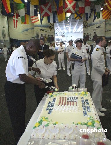 八月二十二日,美国最新的里根号航空母舰在圣地亚哥港切蛋糕,纪念首次举行军人入籍仪式。五十名来自中国、墨西哥、俄罗斯、越南等十二个国家的陆海空男女军人,出席美国移民局和美国西南地区海军联合主办的仪式,宣誓加入美国籍。中新社发 贾国荣 摄