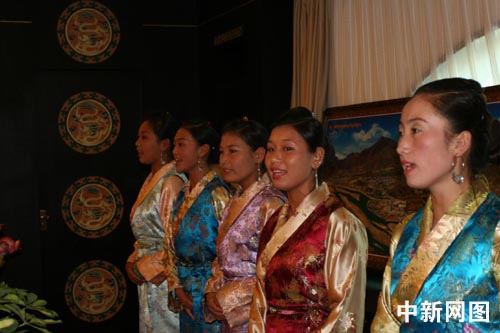 图为成立大会现场拉萨唯一五星级酒店雅鲁藏布酒店内,香港展生集团请来藏族美丽姑娘为八方来宾放歌敬祝"持酒".