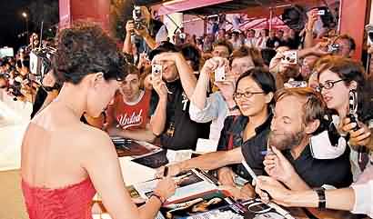 在首映上,有不少外国影迷争相邀章子怡签名合照。