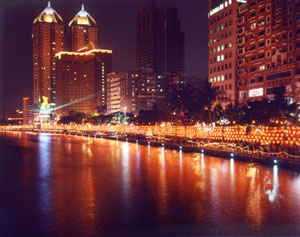 爱河入夜以后沿着水面点点霓虹彩光,东西两岸各具不同情调的"爱河曼波"与"黄金爱河"咖啡艺文广场,散发迷人的咖啡香及快慢交替的美妙乐音,令人不得放慢脚步而融入其中,让港湾城市的水岸休闲风情,为身心灵作彻底的放松。每天下午4:00至11:30可以搭乘爱河观光船游览爱河风光。