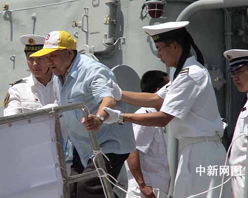 旅美华人华侨连日扶老携幼来到美军珍珠港,参观访问美国的中国海军舰艇编队后,青岛号导弹驱逐舰的子弟兵搀扶老华侨下舰。 贾国荣 摄