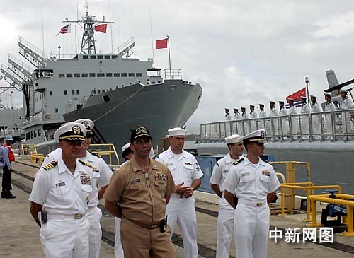 美国海军伊格少将率部在珍珠港向中国海军舰艇编队送行,许多官兵希望将来能回访中国军港。