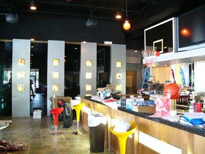 餐厅一角,装潢精美的餐厅内除了姚明的照片外,还有两个篮球架(来源:新华网)