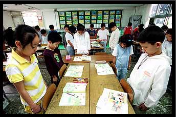 汉城的小学生在默哀仪式上向911死难者致哀。