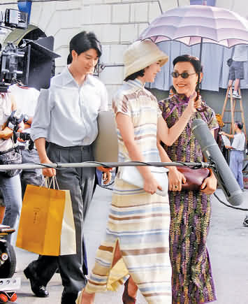据台湾媒体报道,昨天拍的是汤唯、王力宏带着陈冲逛街的戏份。李安将此地的“叶祖意大楼”改装成“美斯百货”,三位主角在十数辆老爷车、上百名临演的簇拥下,从早上九时一直工作到下午六时。