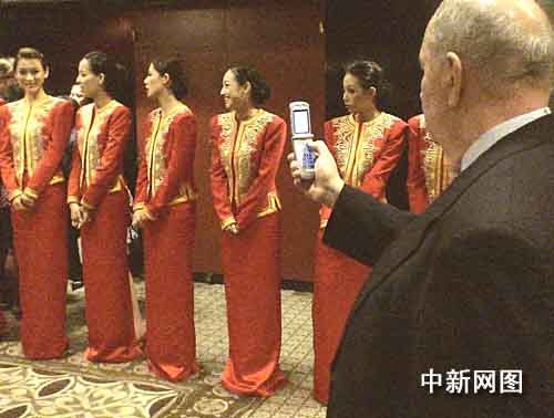 美国男士用手机抓拍北京模特和奥运会吉祥物福娃的精彩图片,弹指间转发给亲朋好友,分享欢乐。作 者:贾国荣