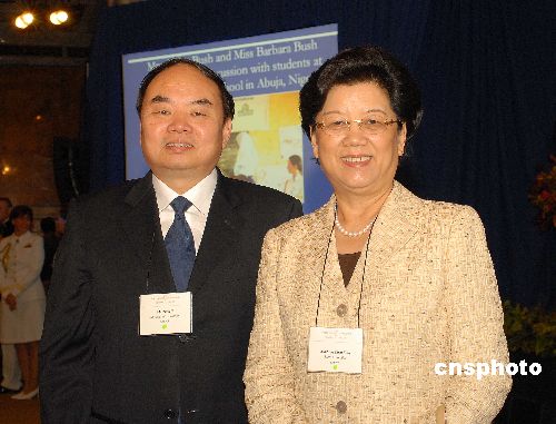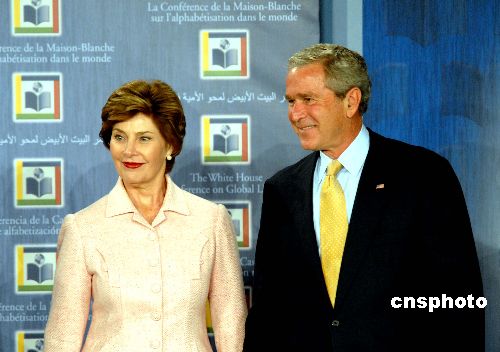 美国第一夫人劳拉当地时间九月十八日在纽约市立图书馆主持了一个题为“全球化扫盲”的会议,美国总统布什、国务卿赖斯以及联合国教科文组织总干事松浦晃一郎出席并发表演讲。中国国务委员陈至立和中国教育部长周济也应邀出席了该会议。中新社发 龚文谟 摄