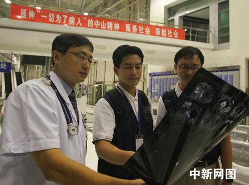 九月二十四日凌晨,担当沪台两地首例医疗急救包机病人转诊任务的国际SOS紧急救援组织中心(台北)的医生郭宏杰(中)、高培杰与上海中山医院医生潘志刚(左)在中山医院为台胞病人李太太会诊并交接工作。作者:潘索菲