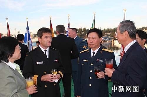 加海军在埃斯奎莫尔特港停泊的“阿冈昆”号军舰上为中国客人举行了甲板招待会。中新社记者吕振亚摄
