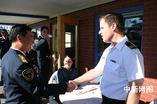 王福山少将与加海军军官亲切交谈。中新社记者吕振亚摄