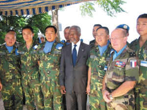 此前,我国外交部发言人秦刚宣布:中国政府已向联合国表示愿意向联合国驻黎巴嫩临时部队增兵。联合国秘书长安南在黎巴嫩南部地区视察时,与黎以交战期间受伤的3名中国维和官兵共进午餐表示慰问,并在讲话中强调:维护世界和平,中国分量越来越重。