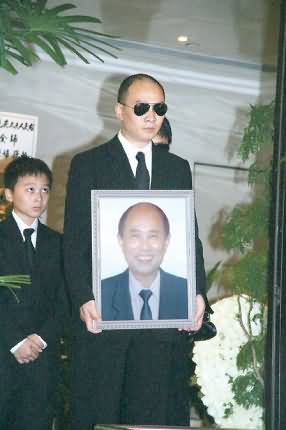 刘嘉玲的弟弟刘嘉勇手捧父亲遗照,神情哀痛。