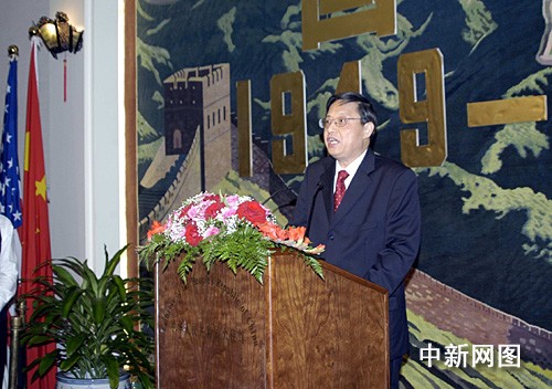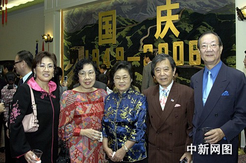 在国庆招待会上,中国驻美大使馆谢传勤公使(中间)和华侨华人代表合影。 作 者:邱江波