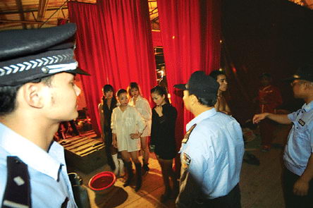 昨晚7时40分,在新搭建的闽清县城关村老人俱乐部外,刺耳的音乐声和挑逗的宣传画引来的路人将大路堵住了半边。“激情演出啊!要多精彩有多精彩。”一名男子指着仅有一薄纱之隔的女子图画卖力地叫着,人群中不少人抵不住诱惑,掏钱进了表演场所。记者在现场看到,有不少是夫妻带着孩子出现在现场。