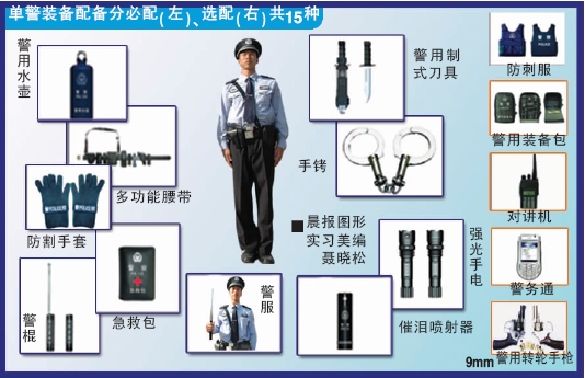 中新网10月1日电 综合公安部网站、《沈阳晚报》、《华商晨报》消息,中国公安部近日正式颁布《公安单警装备配备标准》,10月1日起,济南、呼和浩特、沈阳、襄樊市公安局和秦皇岛市北戴河公安分局等五个试点单位将先行实施,按照《标准》配发民警单警装备。