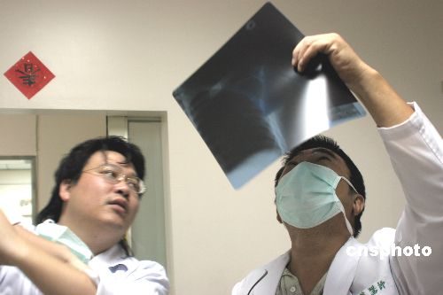 10月3日一时许,台湾南投竹山镇秀传医院医师在察看大陆伤者的x光片,交换治疗意见。