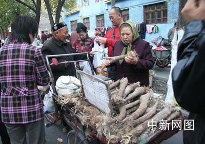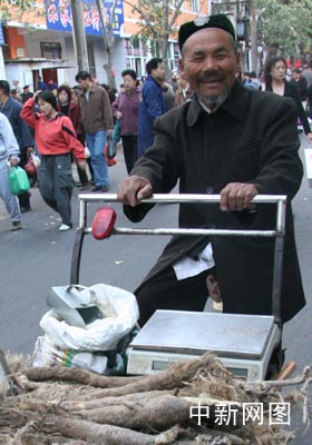 塔哈尔老汉也是个流动商贩,梁女士说:“老汉在这个早市卖阿魏已有7、8年的历史了,人缘不错,经常是没看见人,只要听见叫卖声就知道他来了”。一转身的功夫,塔哈尔老汉的身旁就聚集了不少买家,据说老客户很认可他。
