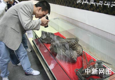 记者在拍摄当年石油工人钻井用的钻头。秦欣 摄