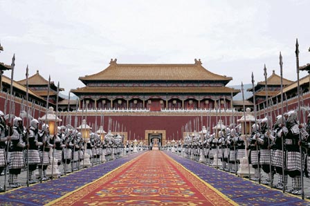一比一的故宫,地毯两旁站满士兵,好不壮观。