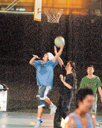 言承旭(左)日前在永和河滨公园打球,表演左手勾射。
