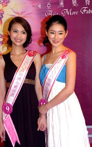 图为9号来自中国台湾的陈瑀涵(左)和11号韩国周正莉现场展示美丽装容。