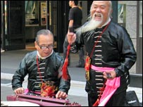 不远处,还有各种乐声缭绕。这厢,是青年学子的口技表演;那头,是中年男子的“锯琴”演奏,一把锯子改装而成的琴,也能拉出不少曲目;再过去,是两位古装打扮的老人家,组成"二伯传承乐团"的表演。