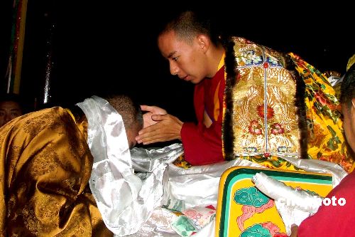 十一世班禅额尔德尼·确吉杰布十月二十一日上午在北京雍和宫接受信徒朝拜。西藏、青海、甘肃、四川、云南等各地高僧大德和有关宗教界人士,中国藏语系高级佛学院师生、雍和宫僧众等三百余人参加了朝拜活动。中新社发 徐长安 摄