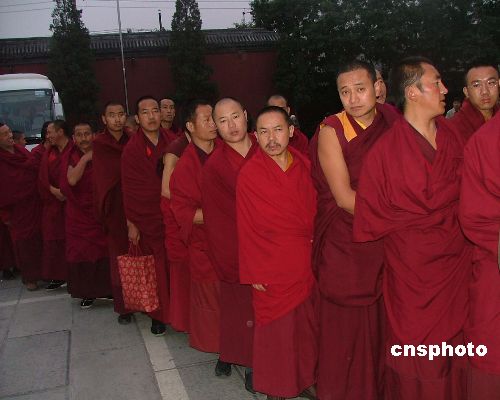为朝拜大师,一批藏传佛教僧人清晨便在雍和宫南门排队等候。