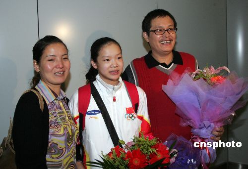 独得世锦赛三金的程菲与父母在机场合影。