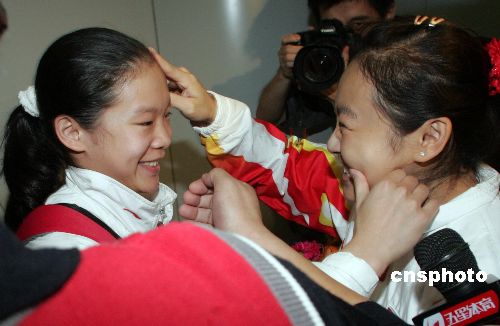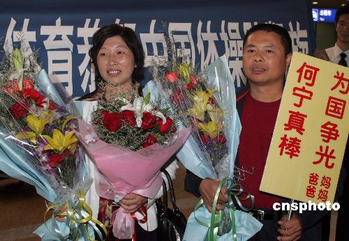夺得女子团体金牌、体操女队中年纪最小的队员何宁的父母在机场迎接女儿凯旋。