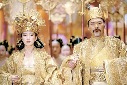 周润发与巩俐穿上金碧辉煌的龙袍及凤袍,尽显气派。