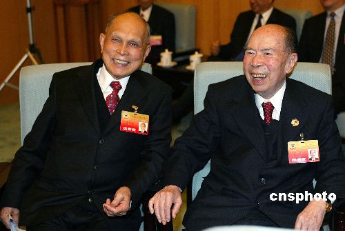 图为霍英东2004年在北京出席全国政协十届二次会议与马万祺在一起。