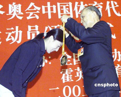 图为霍英东2002年在北京向获得冬奥会首枚金牌的运动员颁发重达1000克的金牌。中新社发 满会乔 摄