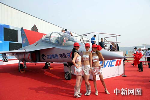 模特现场助兴中国猎鹰高级教练机亮相。孙自法 摄