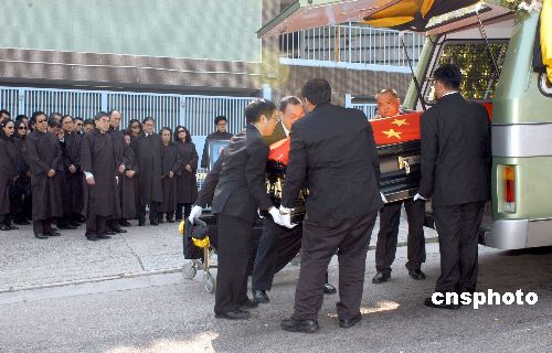 11月10日,已故全国政协副主席霍英东在香港柴湾佛教坟场安葬。中联办两名官员进行一个简单的收国旗仪式,移交予霍英东的家人。完成仪式后,霍英东的灵柩慢慢被移送至墓地安葬,由长孙霍启刚手捧霍英东的遗照,引领其他家属,进行旺冢仪式。中新社发 邓庆乐 摄