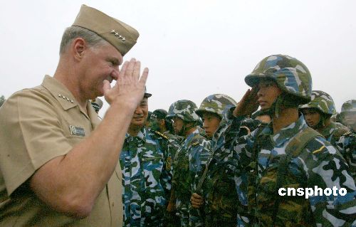 图为美国海军太平洋舰队司令拉夫黑德海军上将与中国海军陆战队队员们进行交谈。