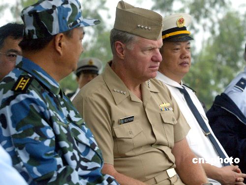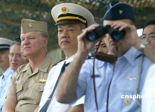 海军南海舰队林永青海军少将和美国海军太平洋舰队司令拉夫黑德海军上将、 海军陆战队某旅旅长陈昌锋正在观看军事表演。