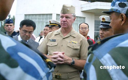 拉夫黑德海军上将观看了中国海军陆战队员的军事表演后与队员们交谈。