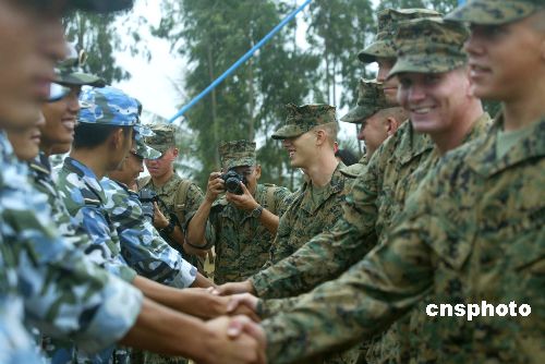 十一月十七日,正在中国南海舰队访问的美国海军“朱诺”号两栖船坞运输舰上的美国海军陆战队员来到中国海军陆战队某旅综合训练场,与中国海军陆战队员进行军事交流活动。中新社发 张勤 摄