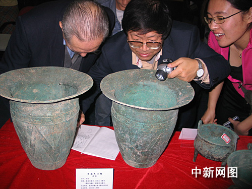 据了解,二00六年十月十五日,扶风县上宋乡红卫村村民在烧砖取土时发现十九件珍贵文物。经鉴定,这批文物出自于西周早期的贵族墓葬中,做工精细造型优美。青铜器分别是鼎一件、簋一件、盂一件、卣两件、壘一件、甗一件、尊一件、戈两件,还有车马器三件、铜泡四件。另外一件为蚌泡。十一月八日,扶风县城关镇五郡西村村民发现一个青铜器窖藏,共出土青铜器二十七件(组),其中青铜礼器有五个编钟,两个大口尊,两个簋,一个鼎,三个斗;青铜兵器有十二个铜矛;还有一组包含一百零三小件的车马器;另有一个汉白玉杖头。